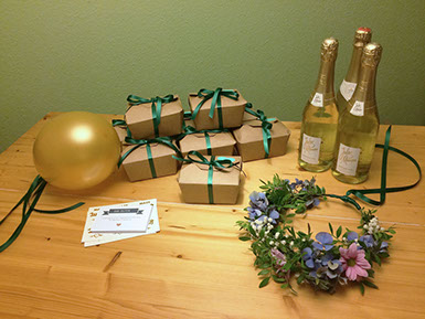 ein Paket mit Kleinigkeiten für den Tag. Die Farben Gold, Smaragdgrün und Lila-Blautöne (Blumenkranz) zogen sich durch den Jungesellenabschied.